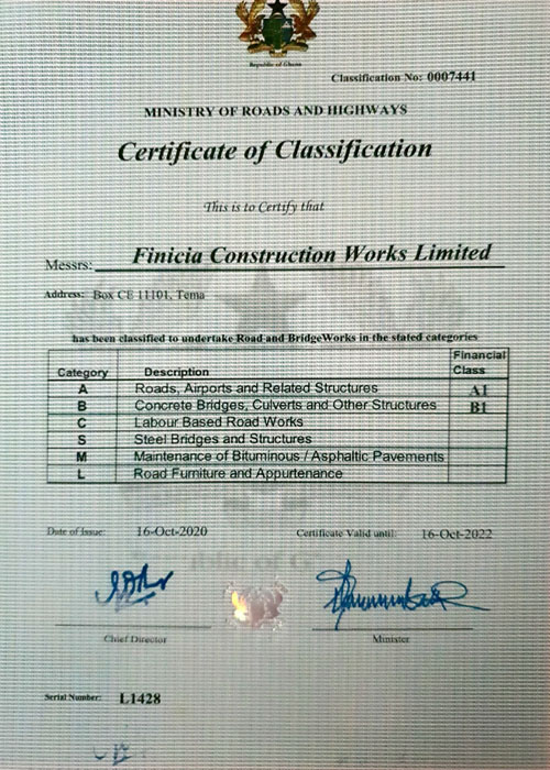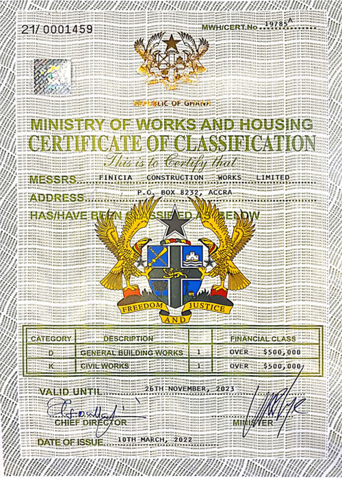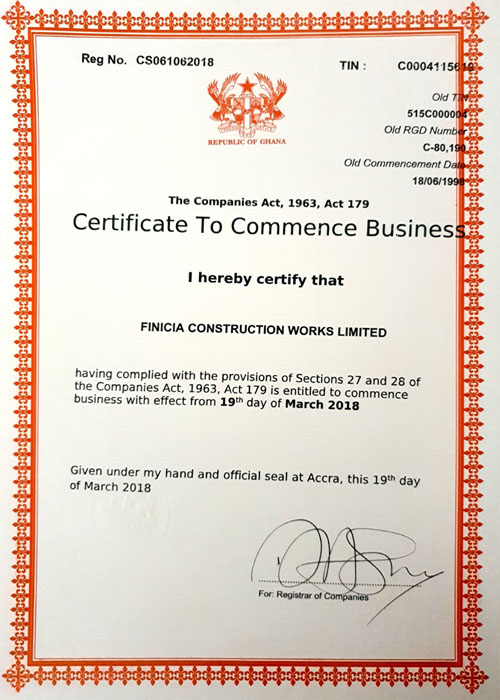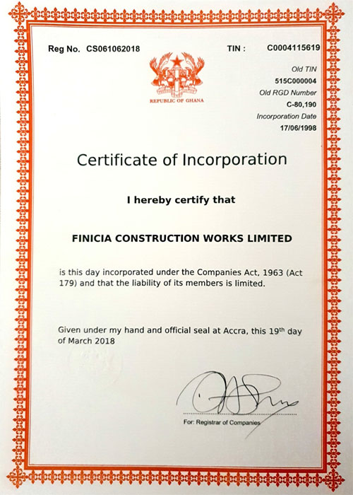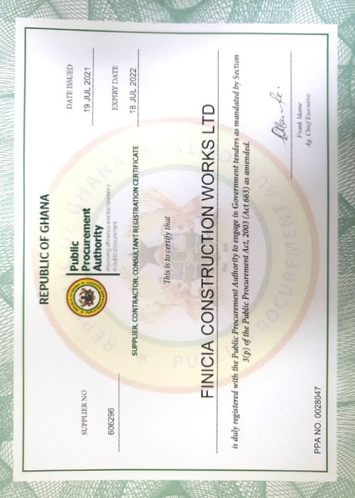 Founded in 1998, Finicia Construction Works Limited is a Ghanaian based Civil Engineering and Construction Company. We specialize in commercial, industrial and residential construction, with a strong performance across all areas of construction Integrity, quality and innovation are the characteristics that distinguish Finicia as one of the leading construction companies. Our goal is to provide a higher level of service than is found with any other company in the construction industry. We consistently bring superior craftsmanship to every project no matter the size.